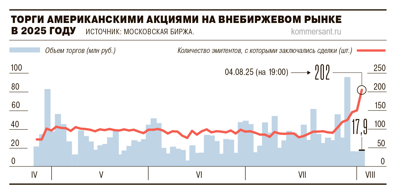 Допуск к внебиржевым торгам в конце июля 2025 года на Московской бирже новой большой группы акций американских компаний пока не вызвал существенного интереса инвесторов. К прежнему списку из 127 акций, которые начали торговаться с конца апреля, добавились ценные бумаги еще 552 эмитентов. Однако шестикратное расширение списка доступных ценных бумаг пока привело лишь к двукратному увеличению количества эмитентов, с акциями которых заключались сделки. Если в мае—июле регулярно заключались сделки с акциями до 100 эмитентов, то 4 августа их количество превысило 200.